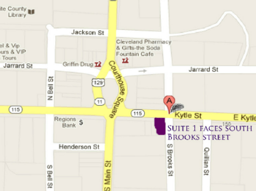 We are Located in the Downtown area of Cleveland Georgia. Just a short distance from Helen and Dahlonaga. From the square in Cleveland go east on Kytle street 1 block to S Brooks Street we are on the corner facing South Brooks street.